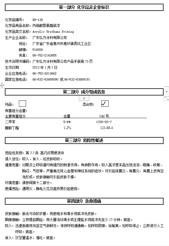 产品总述 BD130 是双组份丙烯酸芳香族聚氨酯底漆。