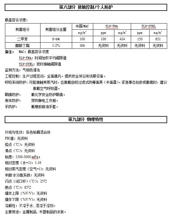 警告:会引起眼睛和皮肤的刺激。反应的蒸汽可能会引起过敏人群的呼吸道刺激。可能会引起皮肤过敏反应。避免呼吸蒸汽。请勿触及眼睛、皮肤。要使用眼、耳、皮肤的防护用具,使用合适的面具,以避免潜在的呼吸道刺激。使用后用清水彻底的清洗皮肤。如有不适请咨询医生。衣物再次使用前要洗涤。如果没有呼吸要进行人工呼吸,最好嘴对嘴,并请医生处理。灼伤:放热反应会使产品变热,超出正常水平。在混合后要小心处理。使用手套。急救:如果不慎接触了眼睛,立即用清水冲洗至少 15 分钟,并脱去污染的衣鞋,用肥皂清洗接触后的皮肤。