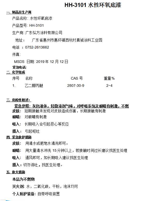 产品总述              HH-3101 是由水性环氧树脂、防锈顔填料、含闪锈抵制剂、水性助剂、水等成分组成的双组份聚胺固